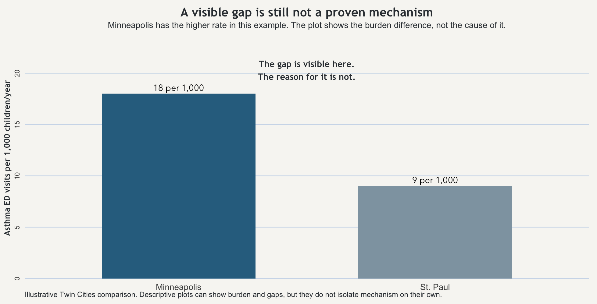 That first sentence is description. Minneapolis has the higher measured asthma-related emergency visit rate. That already tells you something useful. It tells you where the burden appears heavier. It may tell you where monitoring, outreach, or clinical attention should begin. But it is still a descriptive statement.