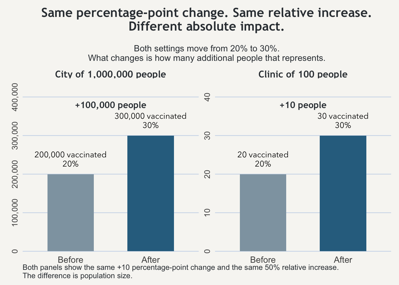 That is the purpose of the figure below. In both settings, the share rises from 20% to 30%. In both settings, the shift is 10 percentage points. In both settings, the later level is 1.5 times the earlier one, which is the same as a 50% relative increase. But one setting represents 100 people and the other represents 1,000,000. The mathematical descriptions of change stay the same while the number of additional affected people changes dramatically.